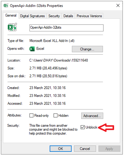 - At the bottom of the General tab you should see a Security section. Check the box that says Unblock. (If security section don’t appear that means file is not blocked)