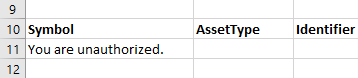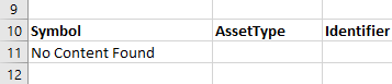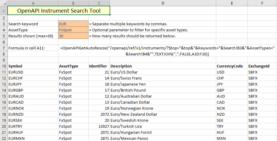 In order to update the the search results every time the search keyword is changed, we use a formula that references the input fields. An API call will automatically be executed and update the search results every time the reference cells are updated. The key to this spreadsheet is the formula in cell A11, which is displayed below. It takes the keyword from cell B3, the AssetType variable from B4, the amount of results to return from B5, and pulls the data fields specified in range A10-F10 using the TEXTJOIN function. The field names in row 10 can be adjusted to pull out different data, such as PrimaryListing (useful for Stock and CFD traders). This way, the search is entirely customizable.