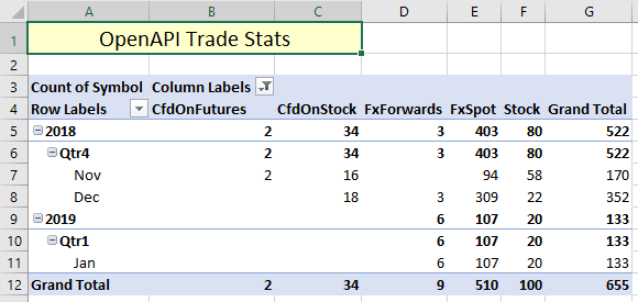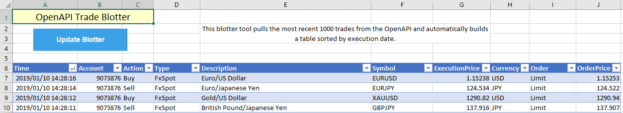 In this tutorial we will explore the /cs/v1/audit/orderactivities/ endpoint with a fairly simple spreadsheet which pulls the latest trades from the user's accounts, loads all data into the specified area on the spreadsheet and automatically creates a table. The table is sorted by ActivityTime, which is the exact time the trade was confirmed on Saxo Bank's servers. Because this endpoint is limited in terms of the number of items it returns, we can only pull the latest 1000 trade confirmations. In addition, the endpoint contains all order activity on the user's accounts, hence filtering by Status is necessary to remove unwanted order confirmations that are not related the actual execution of trades. This tool has a couple of useful features: