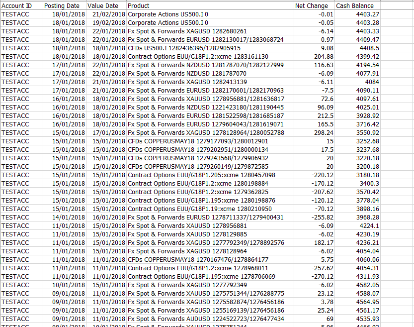 It consists of AccountID, posting date, Value date, product detail, Net Change and Cash Balance.