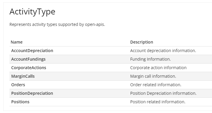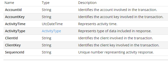 When setting up the subscription the caller must specify which type of activities or events they want to receive information about. Currently four types of events are supported, the contents of each is described further below.