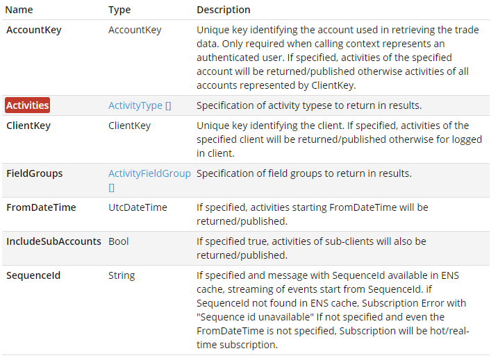 To use the notification service, you setup a subscription to the /ens/v1/activities/subscriptions endpoint. You may specify the following parameters.