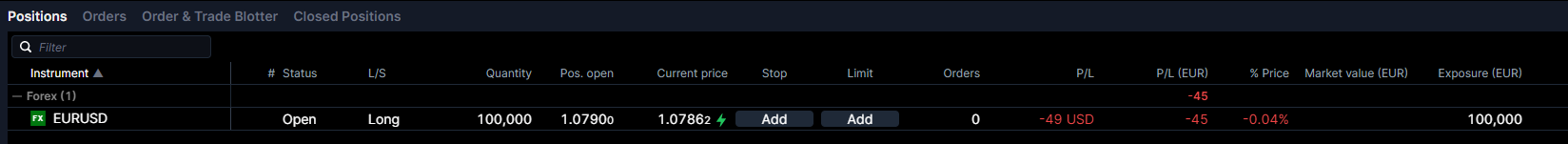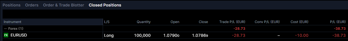 Then we make a market order to sell 100.000 EURUSD. This moves the position from the Positions tab to the Closed Positions tab:
