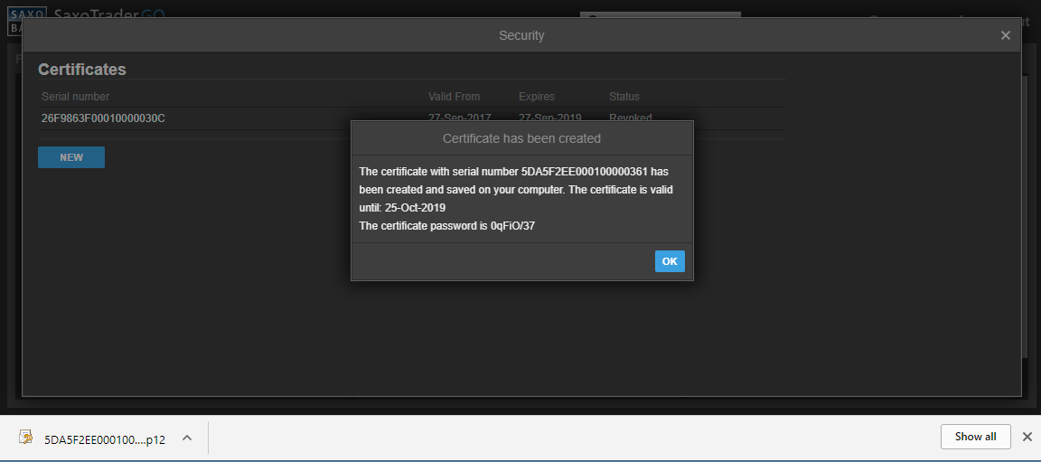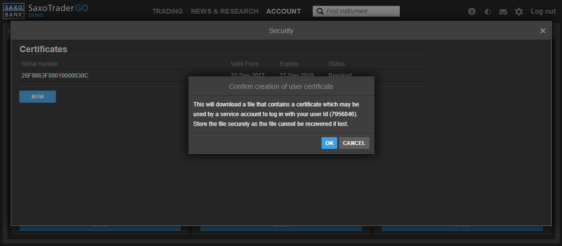 Under certain conditions Saxo Bank will allow users to manage certificates, used to identify themselves. Currently this feature is only available in the LIVE environment, to select partners and only on request.