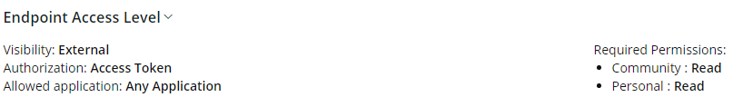 The Endpoint Access Level section gives us information about visibility, authorization and required permissions for the endpoint.