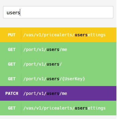 To quickly find an endpoint you can search for any keywords that are part of the endpoints URL. Matching keywords are highlighted.